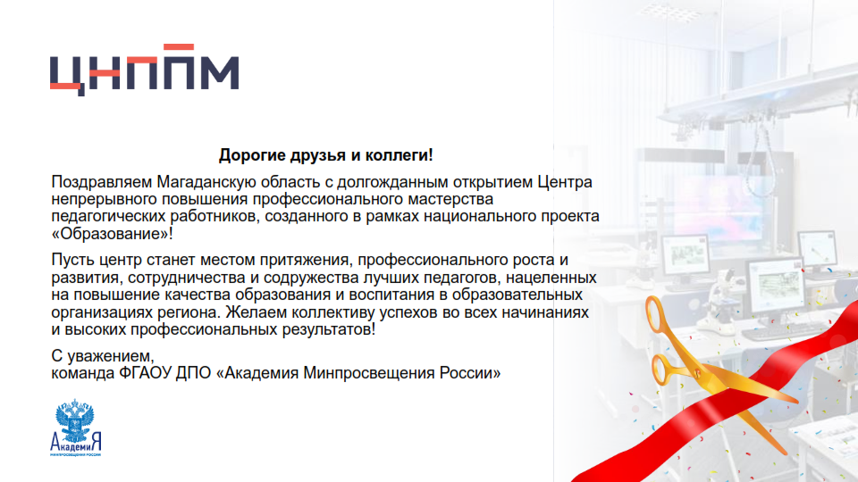Федеральный оператор проекта «Современная школа» Академия Минпросвещения России поздравил с открытием Центр непрерывного повышения профессионального мастерства педагогических работников при МОГАУ ДПО «Институт развития образования и повышения квалификации педагогических кадров».
